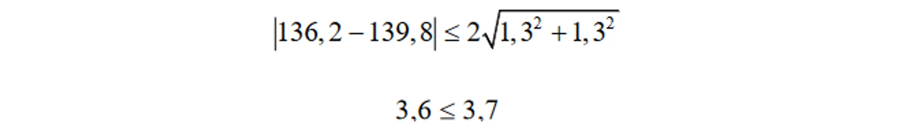 Dosazením do vztahu (1) x𝑐 = 136,2; u𝑐 = 2,6/2 = 1,3; x𝑒 = 139,8; u𝑒 = 1,3 (u𝑒 = (4.1/√10) = 1,3 protože je porovnáván průměr a jeho směrodatná odchylka je s/√n, kde n je počet měření) a k = 2 (volíme přibližně 95% hladinu spolehlivosti), zjistíme, že nerovnost